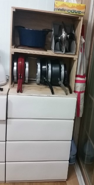 옆으로 뉘어 놓으니 아래칸은 후라이팬 정리로.