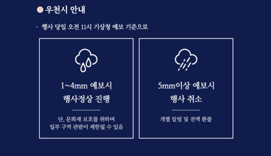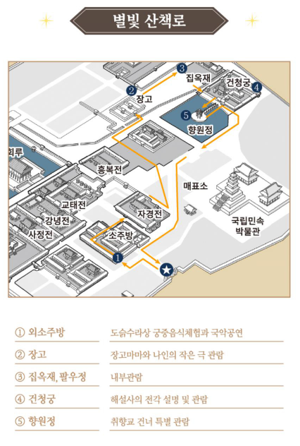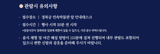 - 경복궁 별빛야행 야간 해설탐방이 약 110분에 걸쳐 진행되며 내부 관람도 포함되어 있으니 편한 신발을 착용해주세요.