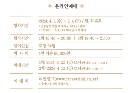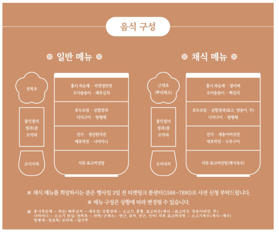 - 채식메뉴를 원하시는 분은 참여일 3일전까지 티켓링크 콜센터(1588-7890)를 통해 사전 신청 부탁드립니다.