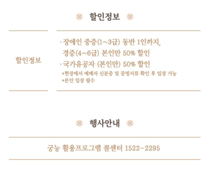 - <경복궁 별빛야행>전화예약 및 할인 혜택을 받은 참가자는 본인이 직접 참석 하셔야 합니다.