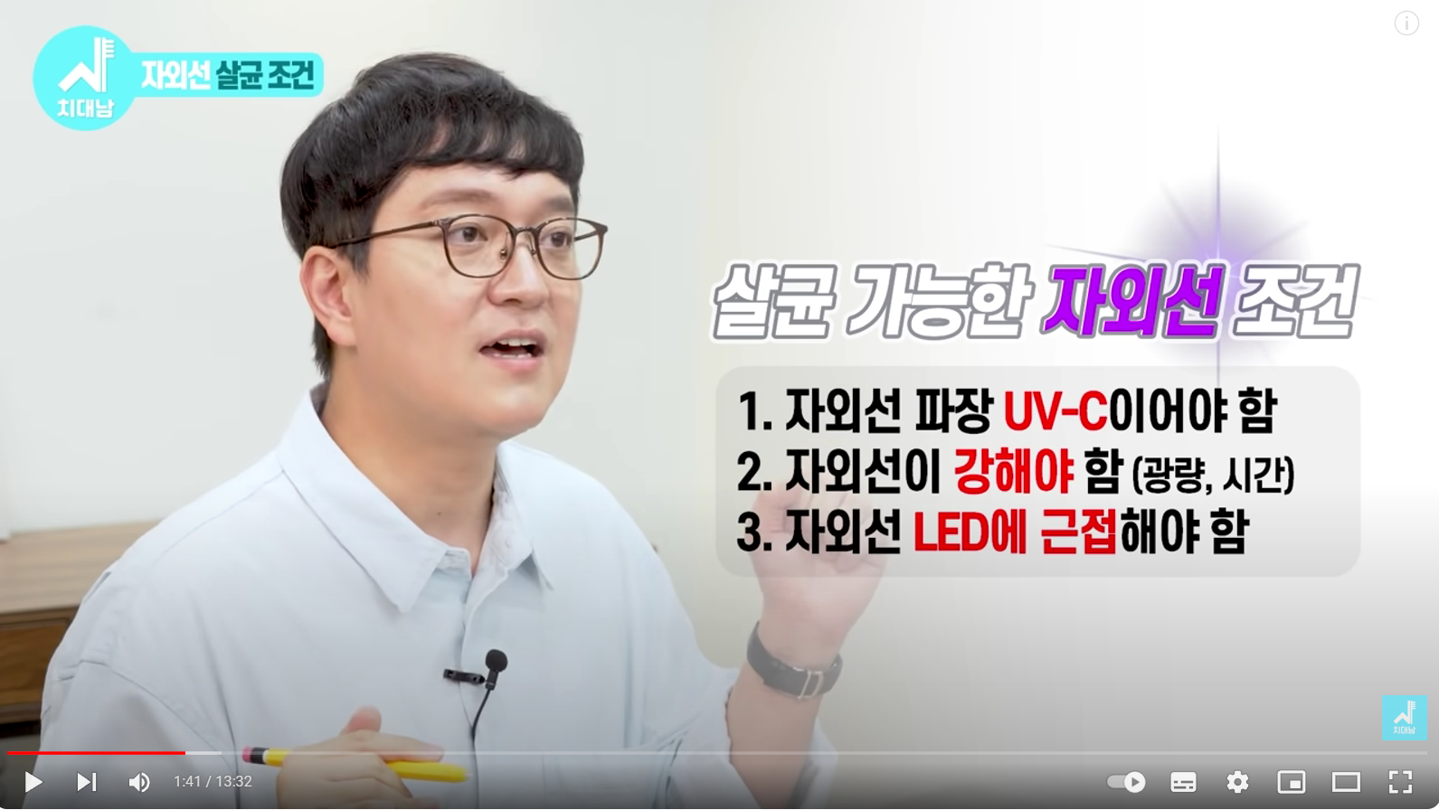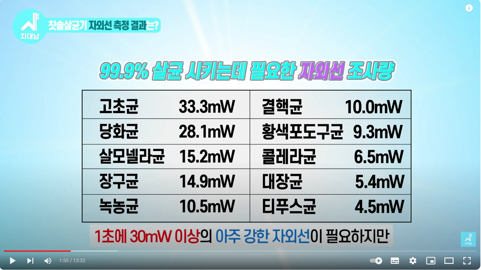 웬만한 세균들을 죽이려면 1초에 30mW 이상의 아주 강한 자외선C파장이 필요하지만