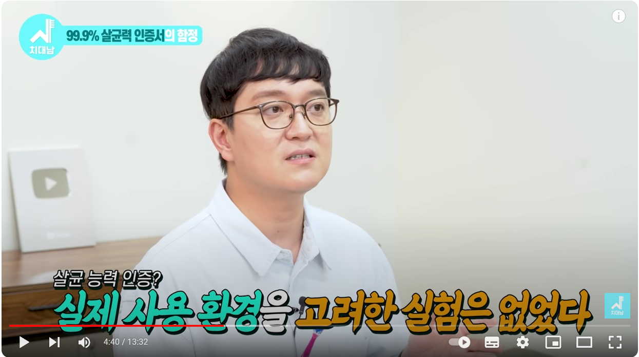 그러면 실제 세균이 죽었는지 측정해보는 실험이 필요한데 이런 회사에서 제출한 실험이 제대로 된 실험이 없었습니다.