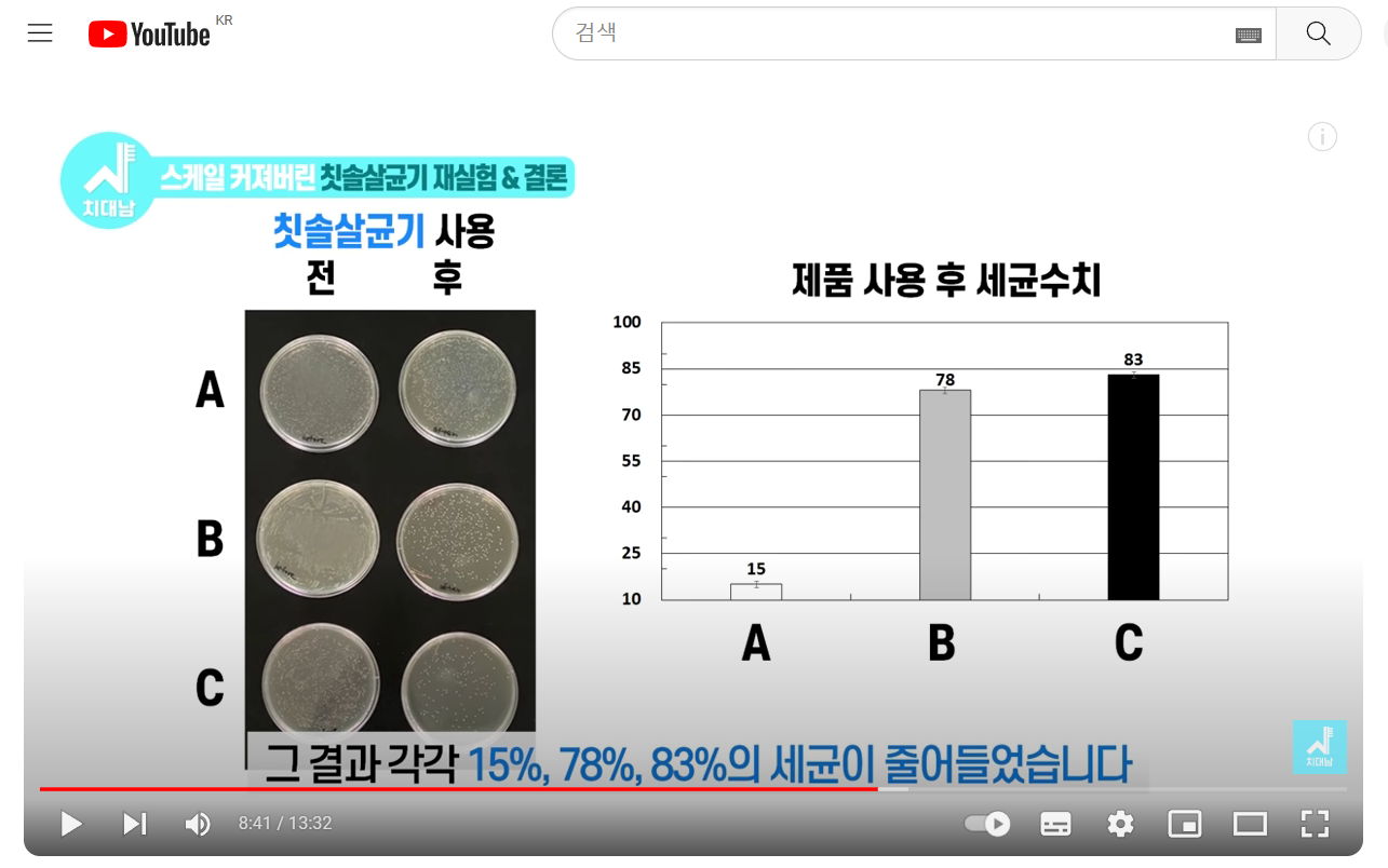 그러면 칫솔살균기 업체의 사람들이 주장하는 99.9%의 세균박멸이 수치로 나오지 않을까 합니다.