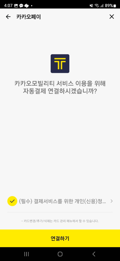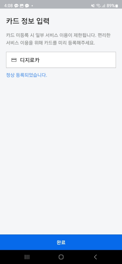 7. 저는 카드 등록 절차를 하지 않았는데 내장되어 있던 카드 등록 정보를 찾아서 자동 등록으로 연결되었습니다.