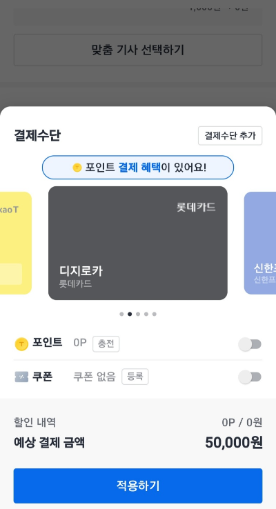 하지만 휴대폰에 저장된 신용카드가 자동검색이 될 수 있으니 한번 진행해보세요.
